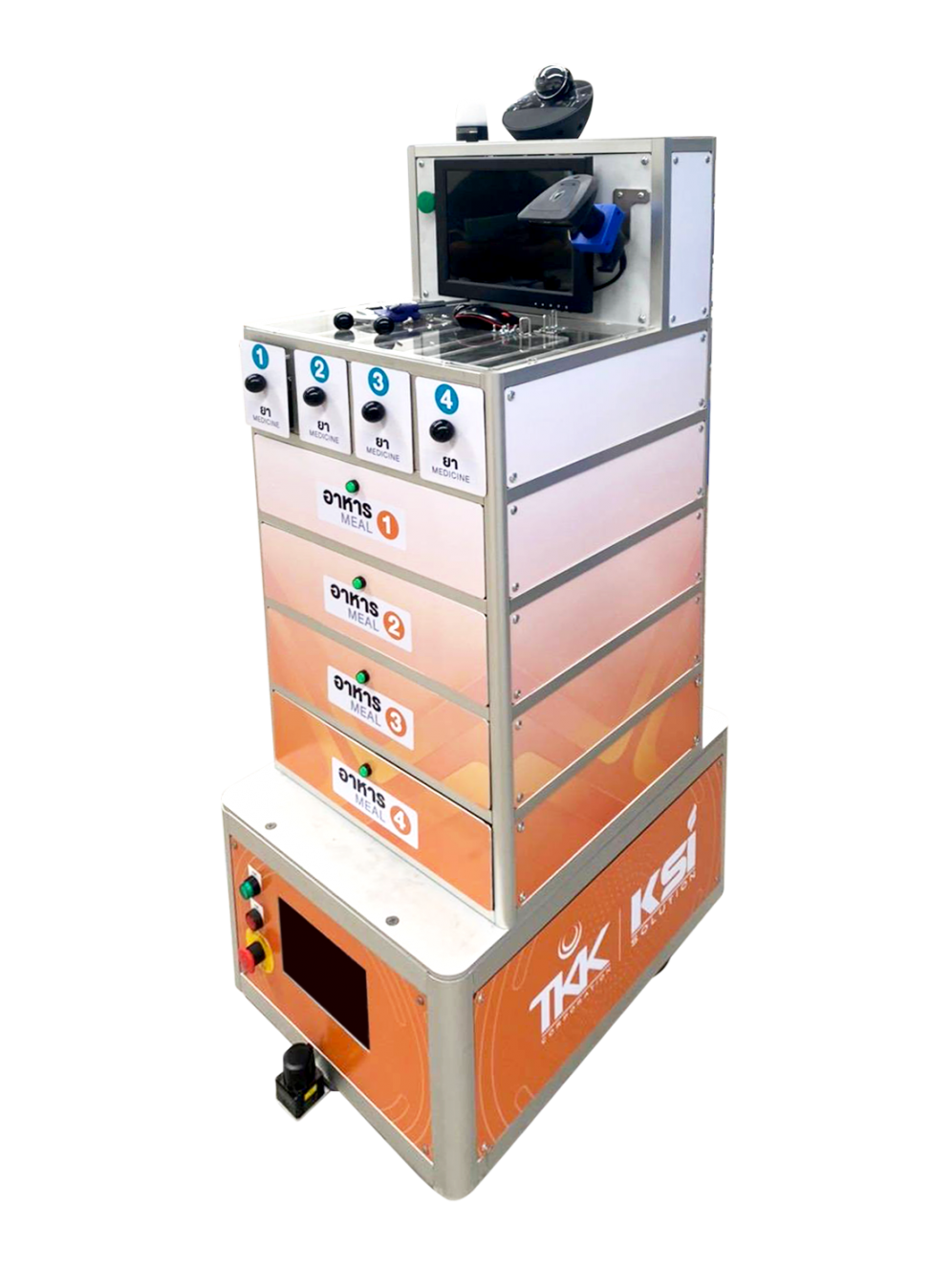 ทีมทำงานต้องลงไปวิจัย เก็บข้อมูลหน้างานจริงๆ ร่วมกับคุณหมอ เราทำงานร่วมกับโรงพยาบาลจุฬาภรณ์ ราชวิทยาลัยจุฬาภรณ์ เราได้เห็นบรรยากาศการทำงานของคุณหมอ ความเสี่ยงที่ต้องเผชิญ เราเห็นภาพว่าคนไข้ที่มามีลักษณะอย่างไรบ้าง เราได้คำแนะนำจากพันธมิตรศูนย์นวัตกรรมหุ่นยนต์และระบบอัตโนมัติ สถาบันการจัดการปัญญาภิวัฒน์ (PIM) วิทยาลัยแพทยศาสตร์นานาชาติจุฬาภรณ์ มหาวิทยาลัยธรรมศาสตร์ ที่ให้คำแนะนำด้านการออกแบบ นั่นจึงเป็นที่มาของการออกแบบฟังก์ชันหุ่นยนต์ ทำงานได้ 2 ระบบ ได้แก่ ขับเคลื่อนทางไกลผ่านระบบ 5G และขับเคลื่อนด้วยตนเองแบบอัตโนมัติ มีระบบสื่อสารทางไกลกับแพทย์ผ่านหน้าจอเรียลไทม์ เพื่อลดความเสี่ยงของบุคลากรทางการแพทย์จากการสัมผัสเชื้อระหว่างการปฏิบัติงาน ระบบสแกนตัวตนผู้ป่วยผ่านกำไลข้อมือ เมื่อนำกำไลไปทาบลิ้นชักก็จะเปิดออกเป็นฟังก์ชันเพื่อป้องกันการผิดพลาดในการนำส่ง ฟังก์ชันตรวจเช็กอุณหภูมิของผู้ป่วยได้โดยไม่ต้องสัมผัส เราใช้เวลา 3 เดือนในการเก็บข้อมูล ประกอบกับอุปกรณ์ความพร้อมที่เรามีอยู่แล้ว โดยใช้ทีมวิศวกรเข้ามาเสริม