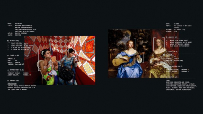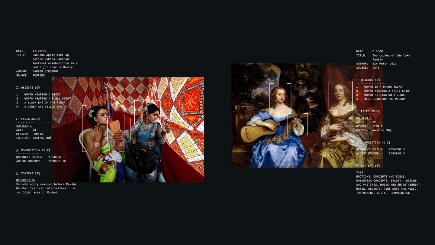 กรณีหอศิลป์เทตบริเทน (Tate Britain) ใช้เทคโนโลยีการจดจำใบหน้าเพื่อสำรวจวิเคราะห์งานสะสมในหมวดศิลปะอังกฤษ และออกแบบแหล่งข้อมูลออนไลน์ชื่อ “Recognition” โดยการเปรียบเทียบงานศิลปะในรูปแบบดิจิทัลจำนวน 30,000 ชิ้นจับคู่กับภาพข่าวเล่าเรื่องของสำนักข่าวรอยเตอร์ ตัวอย่างเช่น ภาพสองสาวแห่งตระกูลเลก (Two Ladies of the Lake Family) ซึ่งเป็นจิตรกรรม ค.ศ. 1660 โดยเซอร์ปีเตอร์ ลีลี (Sir Peter Lely) หัวหน้าจิตรกรในพระเจ้าชาร์ลส์ที่ 2 จับคู่กับภาพถ่ายหญิงข้ามเพศสองคนกำลังแต่งหน้าก่อนงานฉลองเทศกาล “รักษาบันดาล” (Raksha Bandhan) ในย่านโคมแดงของเมืองมุมไบ อินเดีย ในวันที่ 17 สิงหาคม ค.ศ. 2016 แม้ผลงานทั้ง 2 ชิ้นจะมีความแตกต่างกันอย่างชัดเจน ด้วยช่วงเวลาที่ห่างไกลกันหลายศตวรรษและมาจากคนละซีกโลก แต่ทั้งสองภาพก็มีร่างคนสองคนนั่งสวมชุดสีน้ำเงินและเขียวอันหรูหรา ตัดกับพื้นหลังเป็นผ้าม่านสีแดงเข้มเหมือนกัน การจับคู่เปรียบเทียบแบบคาดไม่ถึงนี้ช่วยสร้างประสบการณ์ที่แปลกใหม่ให้กับผู้ชม