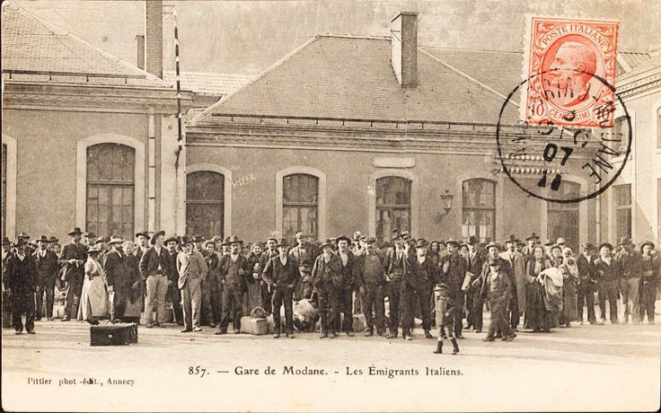 แหล่งที่มา: Immigrants italiens à la gare de Modane. Carte postale. Coll. Musée national de l'histoire de l'immigration. เครดิต: ©EPPPD-MNHI