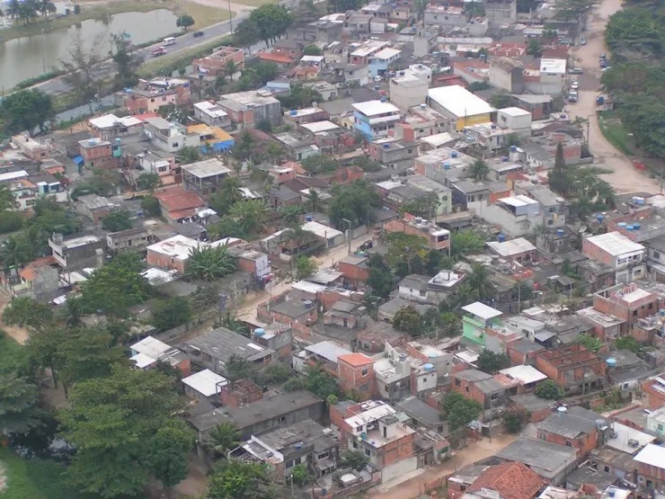 ภาพถ่ายทางอากาศของชุมชนวิลลา ออโตโดรมู ในริโอเดจาเนโร เผยให้เห็นบ้านเรือนแน่นขนัดและตรอกซอยเล็ก ๆ สะท้อนถึงความเข้มแข็งของชุมชน อัตลักษณ์ทางวัฒนธรรม และการต่อสู้เพื่อความอยู่รอดท่ามกลางการพัฒนาเมืองอย่างรวดเร็ว