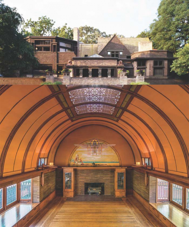 ภาพที่ 2 ภายยนอกและภายในบ้านหลังแรกของไรท์ที่ออกแบบ Oak Park Home