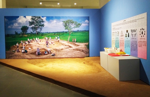 ส่วนห้องถัดมาเป็นยุคสมัยก่อนประวัติศาสตร์ (Prehistoric Period) ที่มีวัตถุจัดแสดงเป็นเครื่องมือเครื่องใช้จาก 3 ยุค (ยุคหิน ยุคสำริด และยุคเหล็ก) มีการทำจำลองผนังถ้ำเพื่อแสดงให้เห็นลักษณะของภาพเขียนสี และมีกิจกรรมเล็กๆ ให้ลองประทับตราพวกรูปภาพเขียนสีในถ้ำ ขยับมาโซนกลางห้องมีจำลองหลุมขุดค้นทางโบราณคดีเป็นจุดสนใจ ซึ่งโดยส่วนตัวผู้เขียนคิดว่างานโบราณคดีช่วยเผยความลับต่างๆ ในอดีตที่ซ่อนอยู่ และเป็นชิ้นส่วนจิ๊กซอว์ที่ทำให้ได้เข้าใจประวัติศาสตร์ได้ดียิ่งขึ้น ทว่า ข้อมูลเกี่ยวกับด้านโบราณคดีในพม่ามีเผยแพร่ทั่วไปน้อยมาก เมื่อได้มาดูในนิทรรศการที่แสดงชุดข้อมูลความรู้ทำให้เห็นว่างานโบราณคดีที่กำลังเติบโตและพัฒนาขึ้นเรื่อยๆ