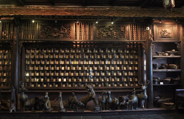 ภาพที่ 3 ชั้นแสดงขวดใส่เครื่องยานับร้อยชนิดวางอยู่ภายในส่วนประกอบของเรือนโบราณ ด้านหน้ามีไม้แกะเป็นสัตว์ต่างๆ