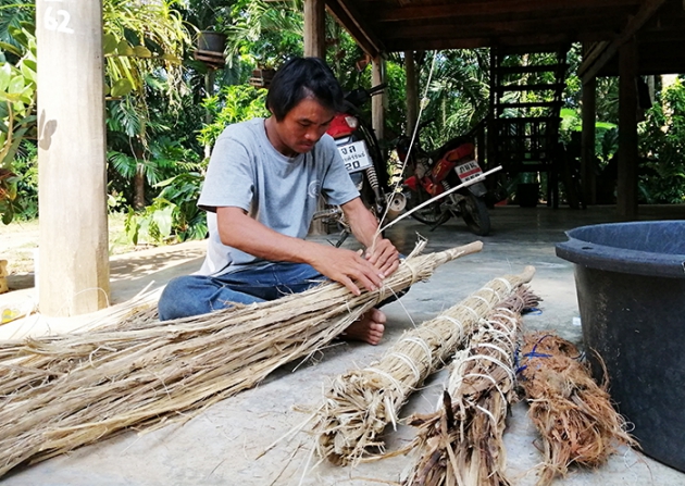 ก่อนนำไปใช้จะต้องตัดให้มีความยาวประมาณ 2 เมตร ลิดหนามออกให้เรียบร้อย แล้วจึงทุบให้เป็นแผ่นแผ่ออกมา จากนั้นฉีกออกเป็นเส้น ๆ นำไปตากแดดโดยใช้ระยะเวลาประมาณ 2 วันขึ้นไป แล้วแต่สภาพภูมิอากาศ เมื่อแห้งสนิทจึงใช้ตอกที่จักไว้มามัดรวมกันให้มีลักษณะเป็นปล้อง ๆ