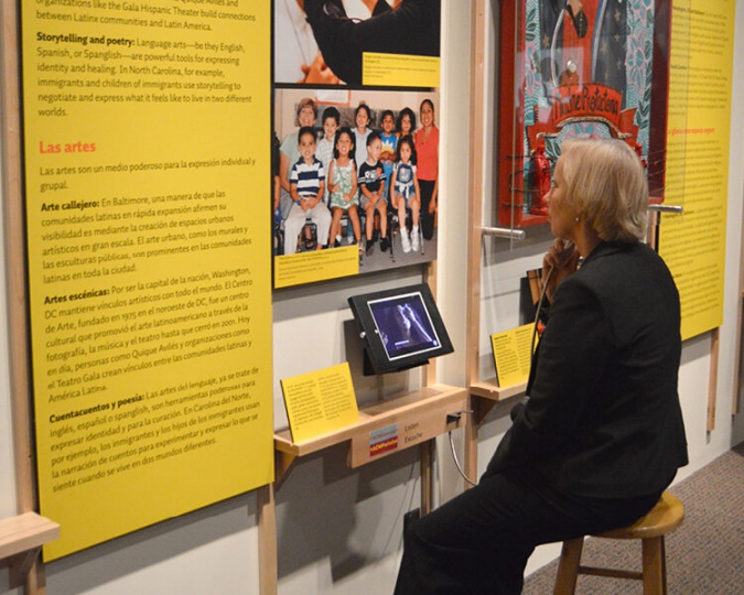 ภาพที่ 1 พิพิธภัณฑ์ชุมชนอนาโคสเตีย ประเทศสหรัฐอเมริกา จัดทำนิทรรศการที่เกี่ยวข้องกับสิทธิมนุษยชนและยุติธรรมสังคม การสร้างบ้านสร้างชุมชน และเทศกาลในฐานะการเสริมพลังชุมชน นิทรรศการ Gateway/Portales (2017-2018) จัดทำในสองภาษา เนื้อหาถ่ายทอดเรื่องราวคนละตินที่ย้ายมาตั้งรกรากในสหรัฐฯ คนที่เผชิญชะตากรรมและประสบความสำเร็จ © Museum Environments (ภาพจาก https://museumenvironments.com/wp-content/uploads/2017/01/Anacostia-Museum-Exhibit-design-ME5-e1644251984576.jpg)