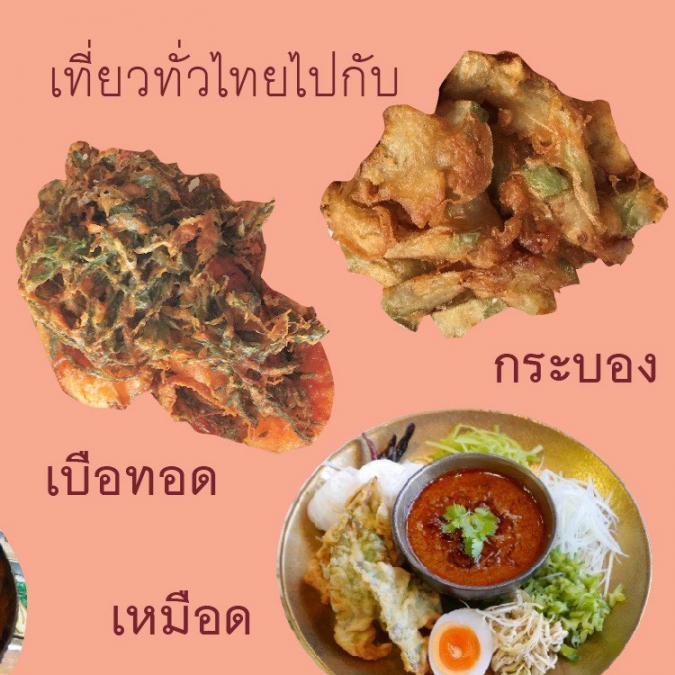 เป็นผักชุบแป้งทอด อย่างเช่น ฟัก น้ำเต้า ฟักทอง มะละกอดิบ หรือแม้กระทั่งหัวปลี หรือถั่วฝักยาว ก็ยังมี