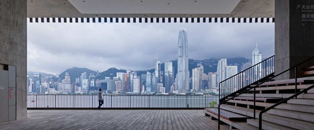 ลานภายใน M+ เผยวิวเส้นขอบฟ้าวิกตอเรียฮาร์เบอร์ เปิดมุมมองฮ่องกงให้ผู้ชมได้ดื่มด่ำในมุมกว้าง (ภาพจาก Image courtesy of HiveLife.com, https://hivelife.com/wp-content/uploads/2021/11/Untitled-design-2021-11-04T095400.498-1024x427.jpg)
