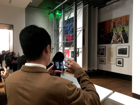 เมื่อก้าวลงจากบันไดเลื่อนไปยังชั้น 2 ของพิพิธภัณฑ์ คุณจะพบ “กำแพง” ที่ไม่เคยหยุดนิ่ง โครงสร้างแผงเลื่อนสี่สิบบานที่มีชื่อเรียบง่ายว่า The Cabinet นี้ ทำหน้าที่เป็นทั้งแกลเลอรีและคลังเก็บ ทุก 2 ชั่วโมง แผงจะเลื่อนตามรางบนเพดาน พลิกสลับผลงานจิตรกรรม ภาพถ่าย และโปสเตอร์ราว 200 ชิ้น จากคลังวัฒนธรรมเชิงภาพของพิพิธภัณฑ์ให้ปรากฏสู่สาธารณะ งานเหล่านี้ไม่มีป้ายคำอธิบายตามแบบเดิม หากแต่มีจอสัมผัสกลางห้องคอยตั้งคำถาม เช่น “ภาพเหล่านี้เชื่อมโยงกันอย่างไร?” เชิญชวนให้ผู้ชม “ดู” ก่อน “อ่าน”