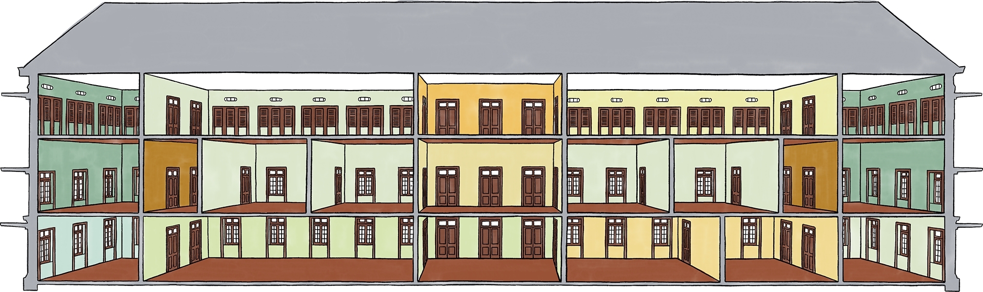 A floor plan was designed as a modular system, which means each floor is comprised of only two sizes of a room. The room was constructed without a center column and a wide structure that allowed the architect to freely divide the space in each room. This modular system has an impact on the entire layout of the building's doors and window voids. For example, a large room consists of three wide window voids and five long window voids, while a small room consists of two wide window voids and three long window voids. These doors and window voids were all installed in exact positions, allowing the ventilation systems to be fully functional and creating a unified appearance for the buildings' interior and exterior.