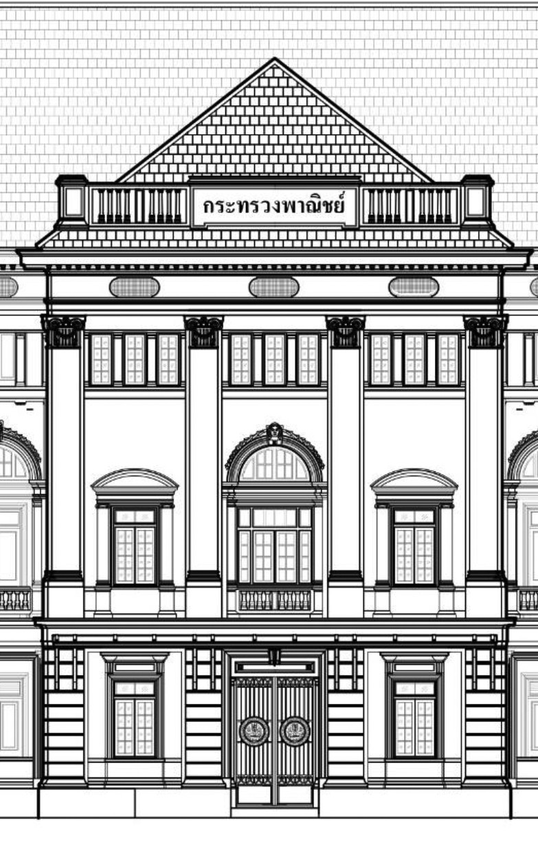 The Ministry of Commerce building was complete in 1922. The architect specified the entrance position for the Ministry of Commerce building at the northeast corner and shifted the building's position against the axis of the northeast entrance. The Ministry building has a symmetrical balance plan with a total of three apses. This design emphasizes the central apse as being more outstanding than the side apse due to its larger size and special decoration. The building plan specifies the location of the main entrance at the central apse in continual with the main staircase, which has load-bearing walls at the central apse with no column. Apart from this, the central apse has a long canopy located above the car drop-off area on the ground floor, and at the pinnacle of the building was a parapet wall installed with the Ministry of Commerce building signage. For these reasons, the central apse is obviously different from the side apses. On the backside of the building, it was designed to reduce the apses to only one wite fewer decoration.